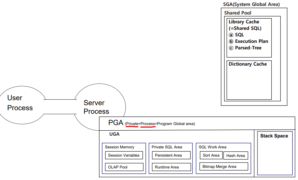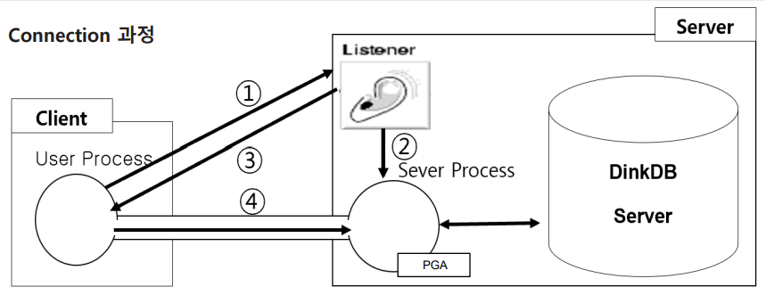 - ์ฐ๊ฒฐ ํต๋ก์ธ ์ปค๋ฅ์ (Connection)์ด ํ์ฑ๋๊ณ DBMS ์๋ฒ๋ด์๋ ์ปค๋ฅ์ ์ํ๋ฅผ ๊ด๋ฆฌํ๊ณ ์๋น์ค ํ๊ธฐ ์ํ ๋ฉ๋ชจ๋ฆฌ ๊ตฌ์กฐ์ฒด์ธ ์ธ์ (Session)์ด PGA๋ด์ ํ ๋น