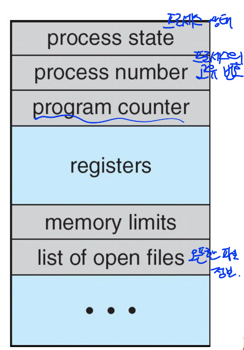 - CPU 스케줄링 정보(CPU-scheduling information) : 프로세스 실행 순서를 정하는 정보