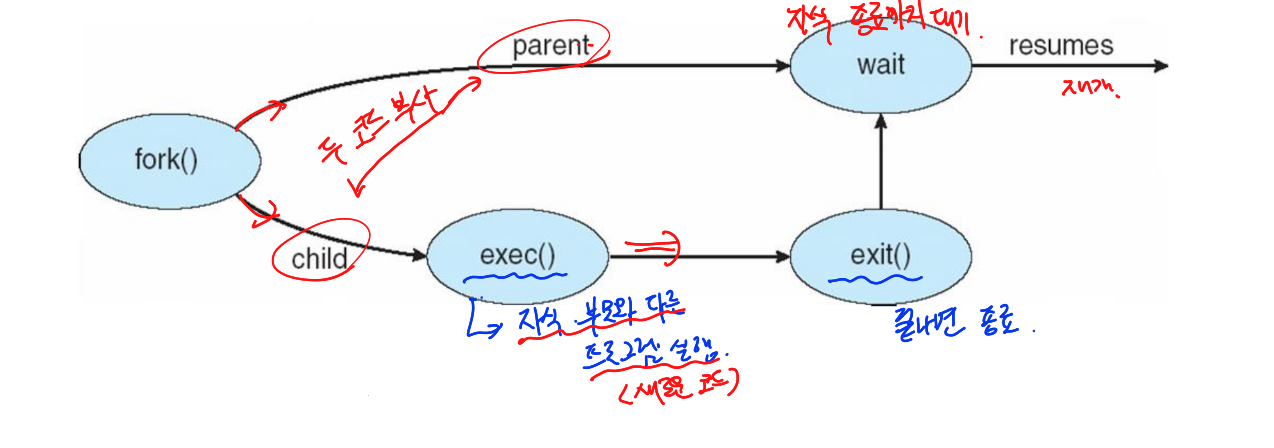 - exec() : 자식 프로세스가 새로운 프로그램을 적재하여 실행