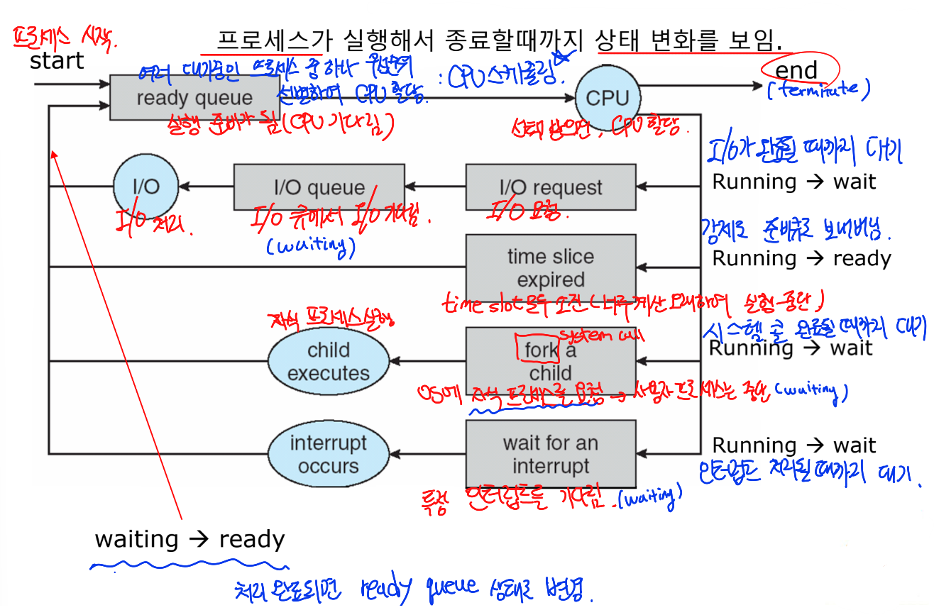 프로세스는 다양한 종류의 큐를 왔다 갔다 하면서 실행된다.