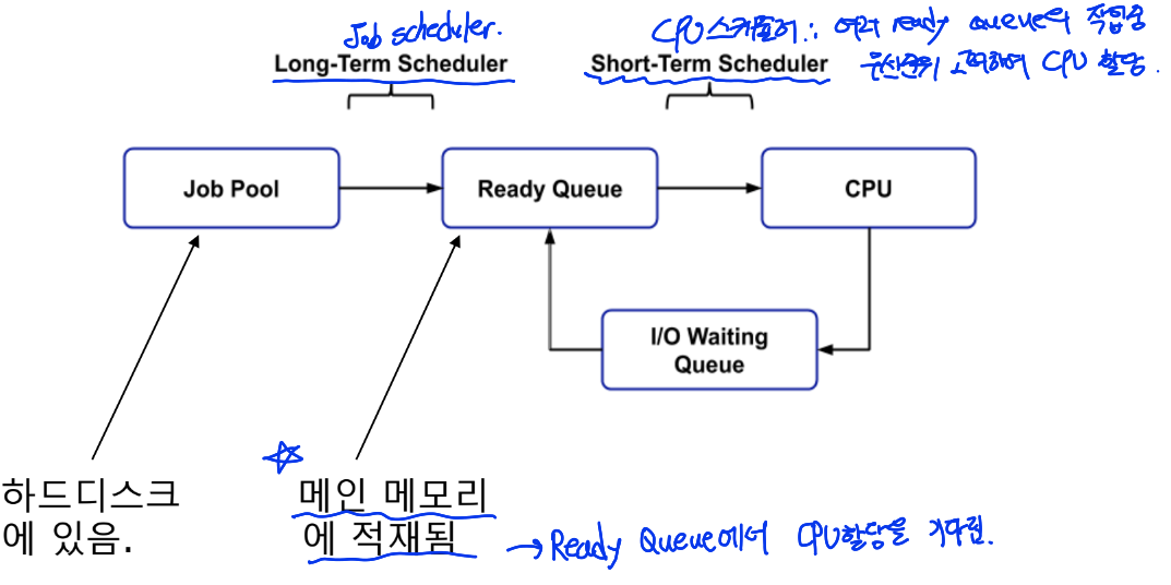 - Job queue : 시스템에 있는 모든 프로세스를 저장