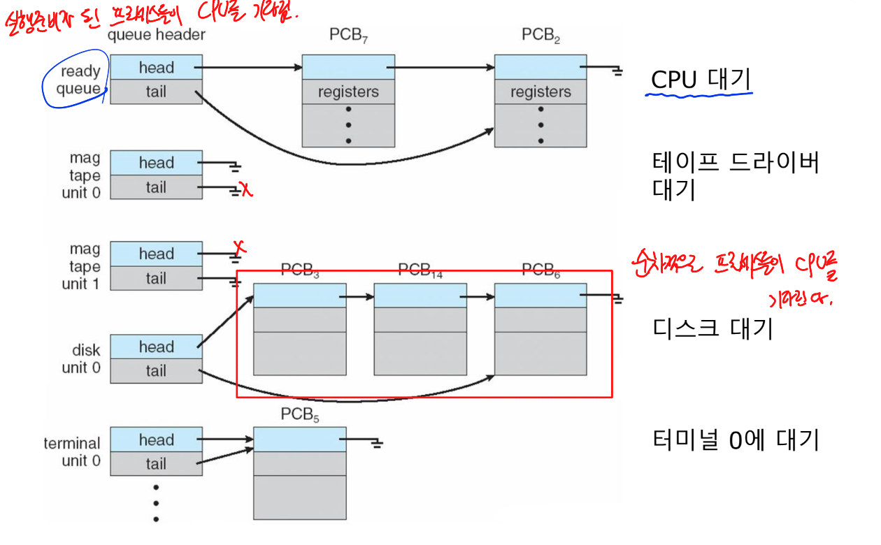 프로세스 관리 위해서 OS는 다양한 종류의 큐를 관리한다.