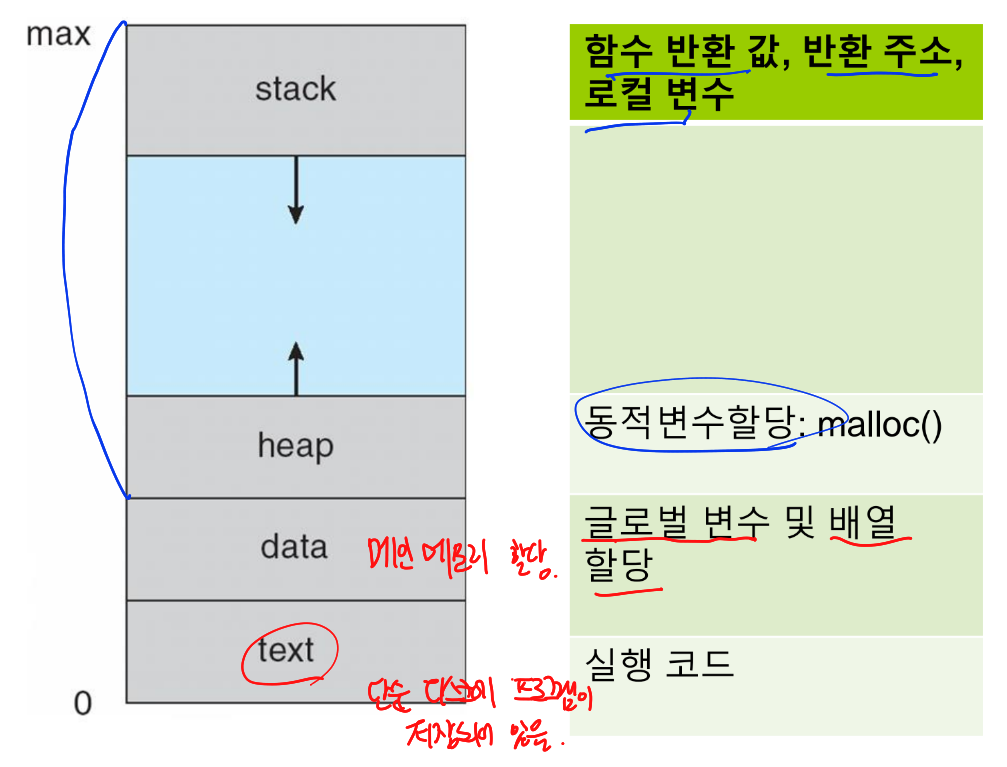 - 프로세스는 다음과 같은 메모리 공간 할당