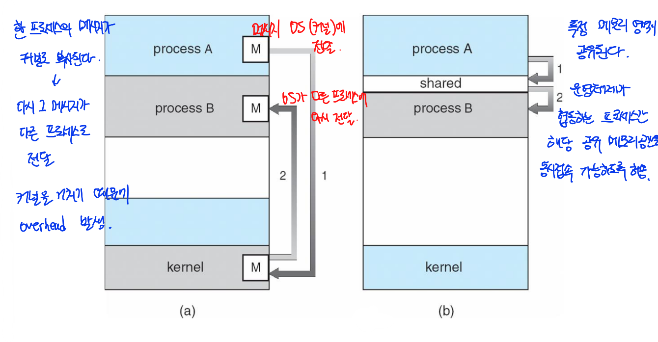 - 메시지 패싱(Message passing) - OS(kernel)을 거치기 때문에 느리다