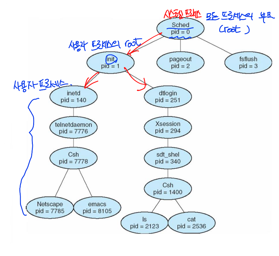 OS는 프로세스를 생성하는 시스템 콜 (System call)을 제공. 부모 프로세스가 자식 프로세스를 만들 수 있음. (트리구조)